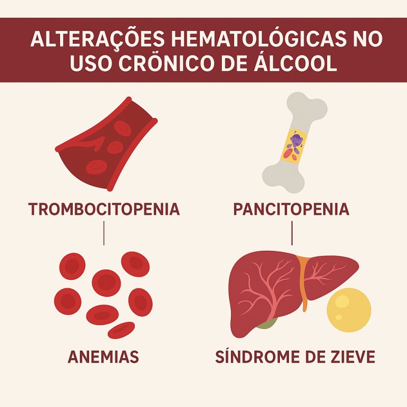 Trombocitopenia alcoólica: pode ocorrer pela redução da trombopoietina hepática ou pelo hiperesplenismo decorrente de hipertensão portal em hepatopatias alcoólicas.
